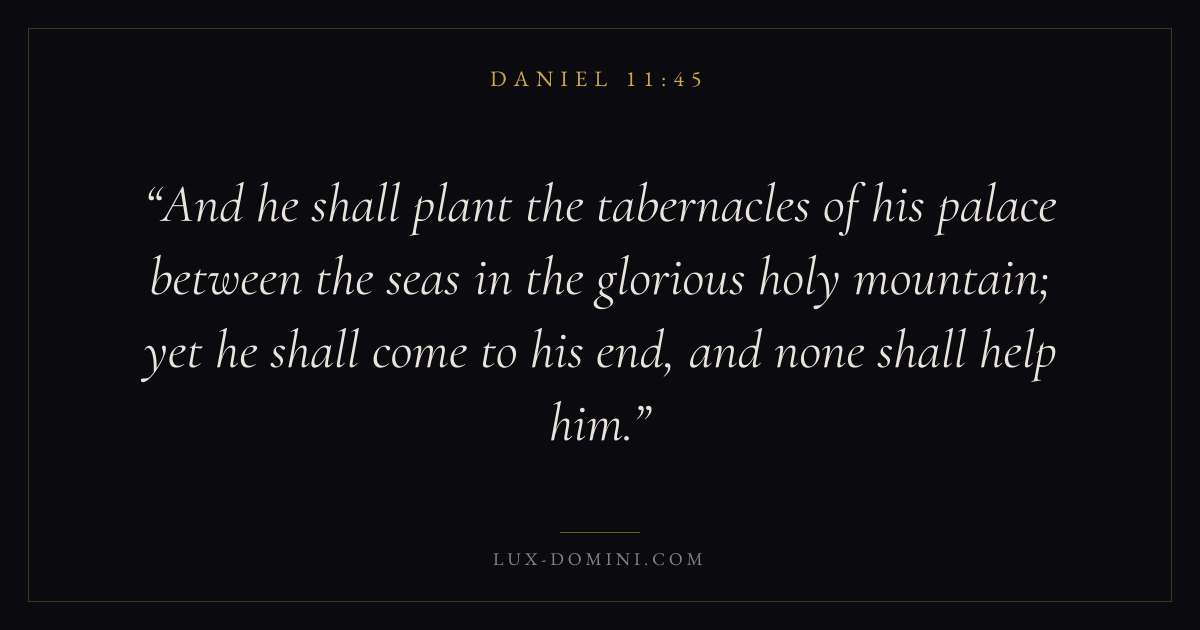 And he shall plant the tabernacles of his palace between the seas in the glorious holy mountain; yet he shall come to his end, and none shall help him.