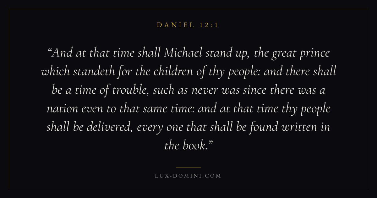 And at that time shall Michael stand up, the great prince which standeth for the children of thy people: and there shall be a time of trouble, such as never was since there was a nation even to that same time: and at that time thy people shall be delivered, every one that shall be found written in the book.