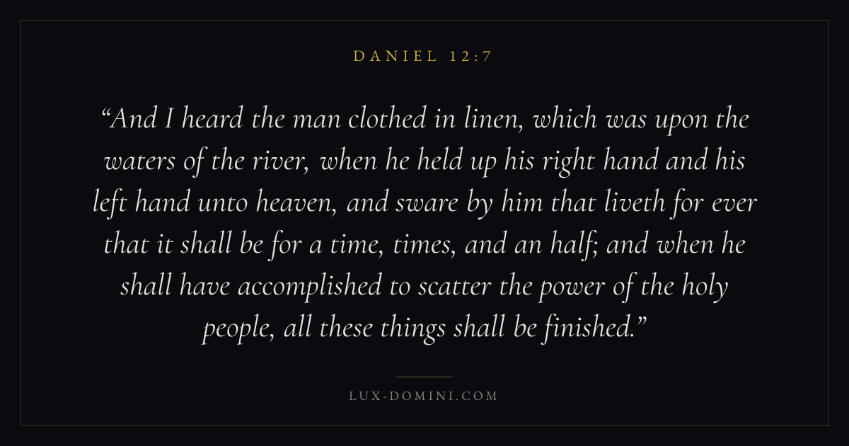 And I heard the man clothed in linen, which was upon the waters of the river, when he held up his right hand and his left hand unto heaven, and sware by him that liveth for ever that it shall be for a time, times, and an half; and when he shall have accomplished to scatter the power of the holy people, all these things shall be finished.