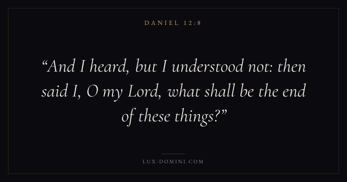 Books / Daniel / Chapter 12 / Verse 8 ← Daniel 12:7 Daniel 12:8 Daniel 12:9 → And I heard, but I understood not: then said I, O my Lord, what shall be the end of these things? Download verse card Share on Twitter Share on Facebook Pin it ✦ Key themes HopePrayerWisdomExile Read with Daniel 12:5Daniel 12:6Romans 8:24Revelation 21:4 Related topics Bible verses about hopeBible verses about prayerBible verses about wisdom ✦ Daniel Chapter 12 verses V. 1 V. 2 V. 3 V. 4 V. 5 V. 6 V. 7 V. 8 V. 9 V. 10 V. 11 V. 12 V. 13