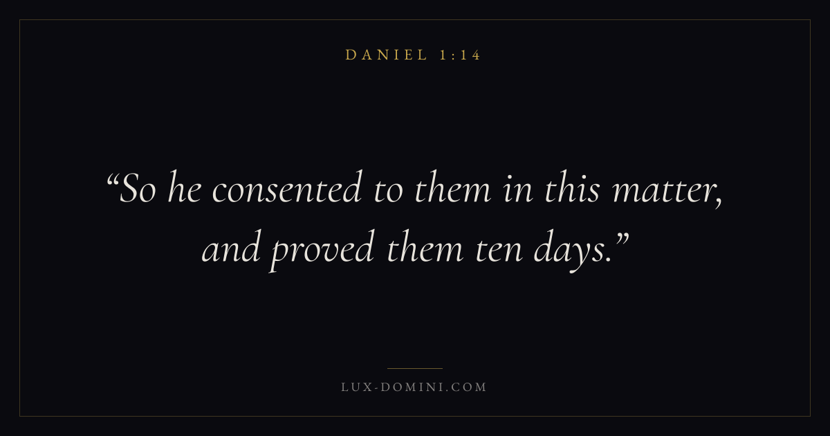 Books / Daniel / Chapter 1 / Verse 14 ← Daniel 1:13 Daniel 1:14 Daniel 1:15 → So he consented to them in this matter, and proved them ten days. Download verse card Share on Twitter Share on Facebook Pin it ✦ Key themes HopeWisdomPeaceGraceExile Read with Daniel 1:13Daniel 1:15Romans 8:24Revelation 21:4 Related topics Bible verses about hopeBible verses about wisdomBible verses about peaceBible verses about grace ✦ Daniel Chapter 1 verses V. 1 V. 2 V. 3 V. 4 V. 5 V. 6 V. 7 V. 8 V. 9 V. 10 V. 11 V. 12 V. 13 V. 14 V. 15 V. 16 V. 17 V. 18 V. 19 V. 20 V. 21