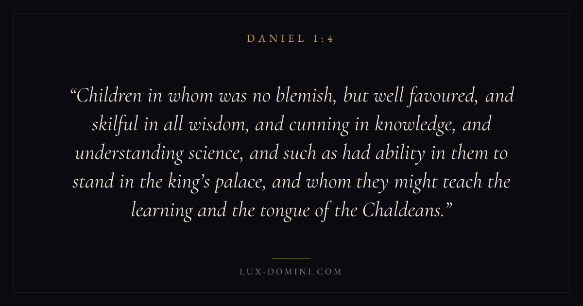 Children in whom was no blemish, but well favoured, and skilful in all wisdom, and cunning in knowledge, and understanding science, and such as had ability in them to stand in the king’s palace, and whom they might teach the learning and the tongue of the Chaldeans.