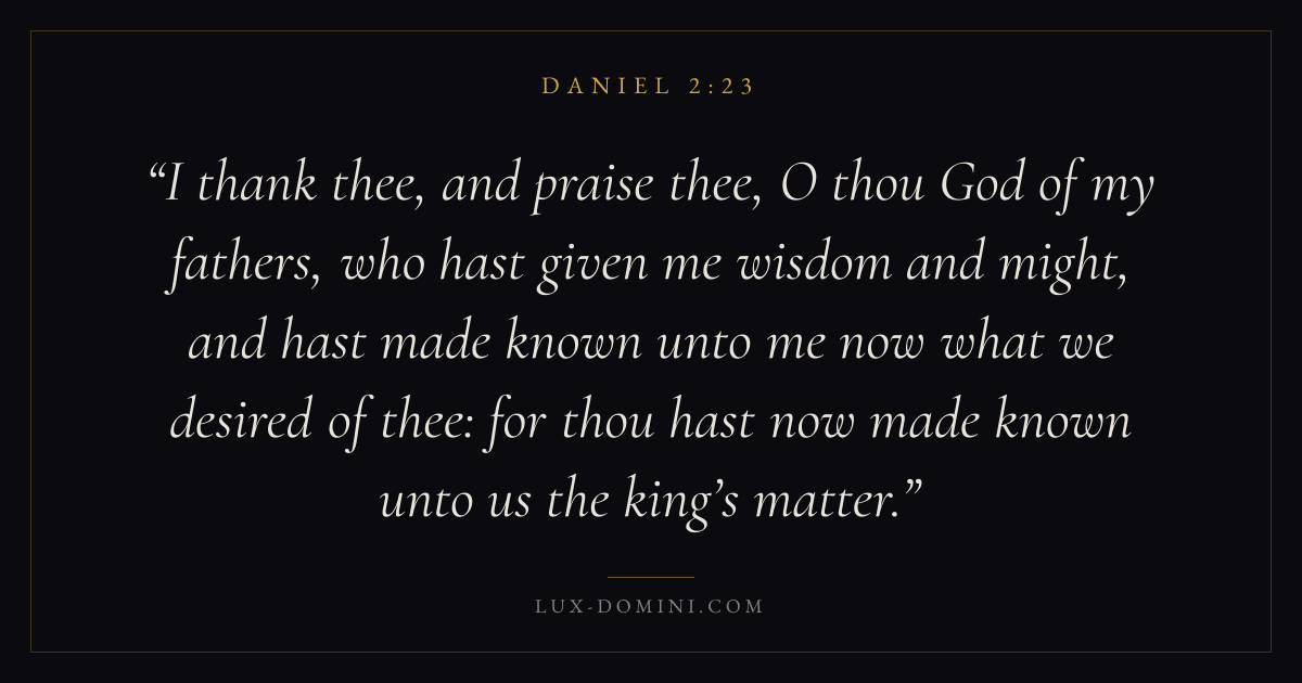 I thank thee, and praise thee, O thou God of my fathers, who hast given me wisdom and might, and hast made known unto me now what we desired of thee: for thou hast now made known unto us the king’s matter.