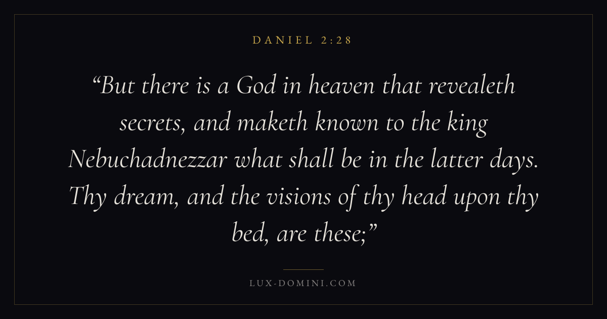 But there is a God in heaven that revealeth secrets, and maketh known to the king Nebuchadnezzar what shall be in the latter days. Thy dream, and the visions of thy head upon thy bed, are these;