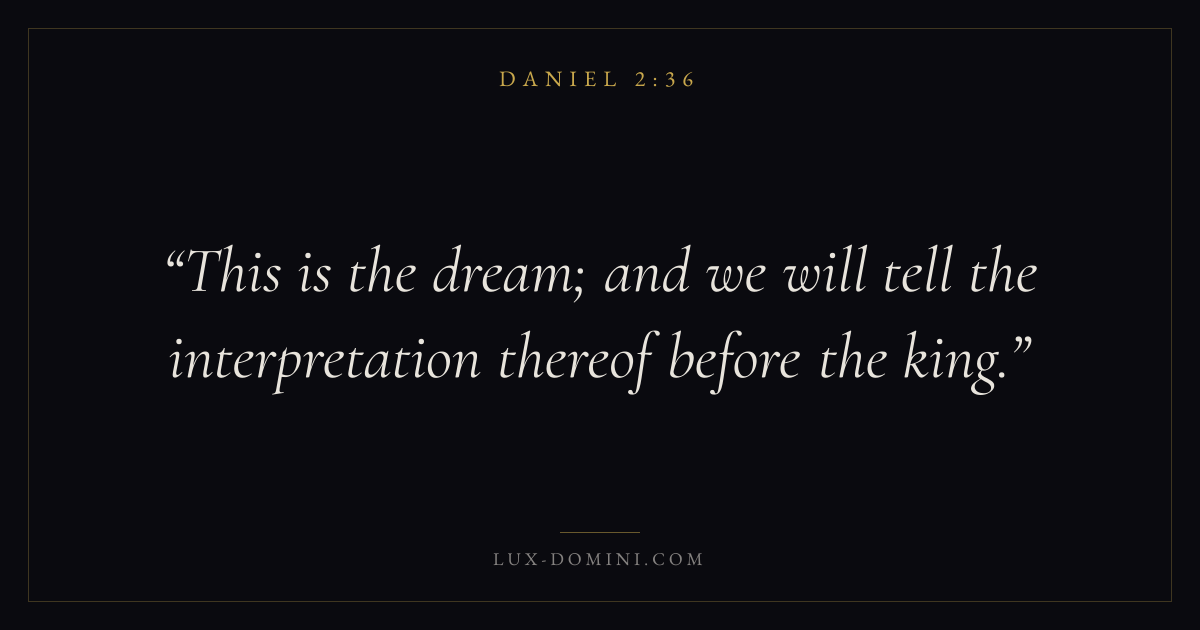 Books / Daniel / Chapter 2 / Verse 36 ← Daniel 2:35 Daniel 2:36 Daniel 2:37 → This is the dream; and we will tell the interpretation thereof before the king. Download verse card Share on Twitter Share on Facebook Pin it ✦ Key themes HopeWisdomExileKingdom of God Read with Romans 8:24Revelation 21:4Proverbs 1:7James 1:5 Related topics Bible verses about hopeBible verses about wisdom ✦ Daniel Chapter 2 verses V. 1 V. 2 V. 3 V. 4 V. 5 V. 6 V. 7 V. 8 V. 9 V. 10 V. 11 V. 12 V. 13 V. 14 V. 15 V. 16 V. 17 V. 18 V. 19 V. 20 V. 21 V. 22 V. 23 V. 24 V. 25 V. 26 V. 27 V. 28 V. 29 V. 30 V. 31 V. 32 V. 33 V. 34 V. 35 V. 36 V. 37 V. 38 V. 39 V. 40 V. 41 V. 42 V. 43 V. 44 V. 45 V. 46 V. 47 V. 48 V. 49