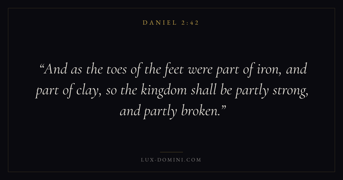 And as the toes of the feet were part of iron, and part of clay, so the kingdom shall be partly strong, and partly broken.