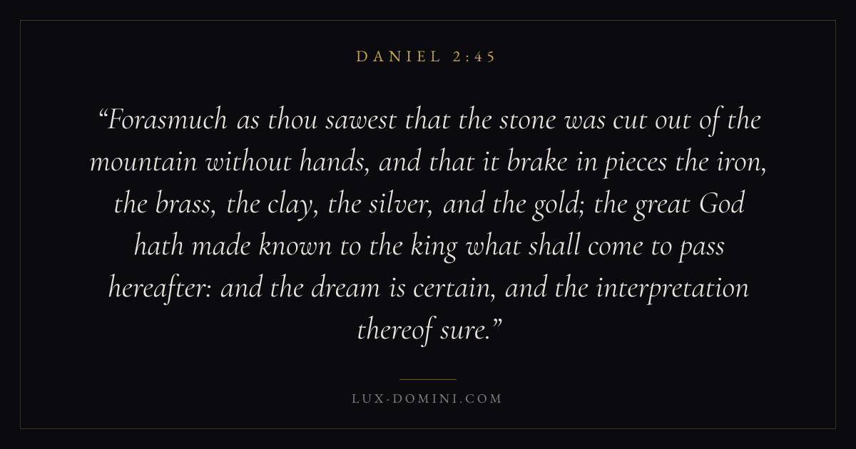 Forasmuch as thou sawest that the stone was cut out of the mountain without hands, and that it brake in pieces the iron, the brass, the clay, the silver, and the gold; the great God hath made known to the king what shall come to pass hereafter: and the dream is certain, and the interpretation thereof sure.