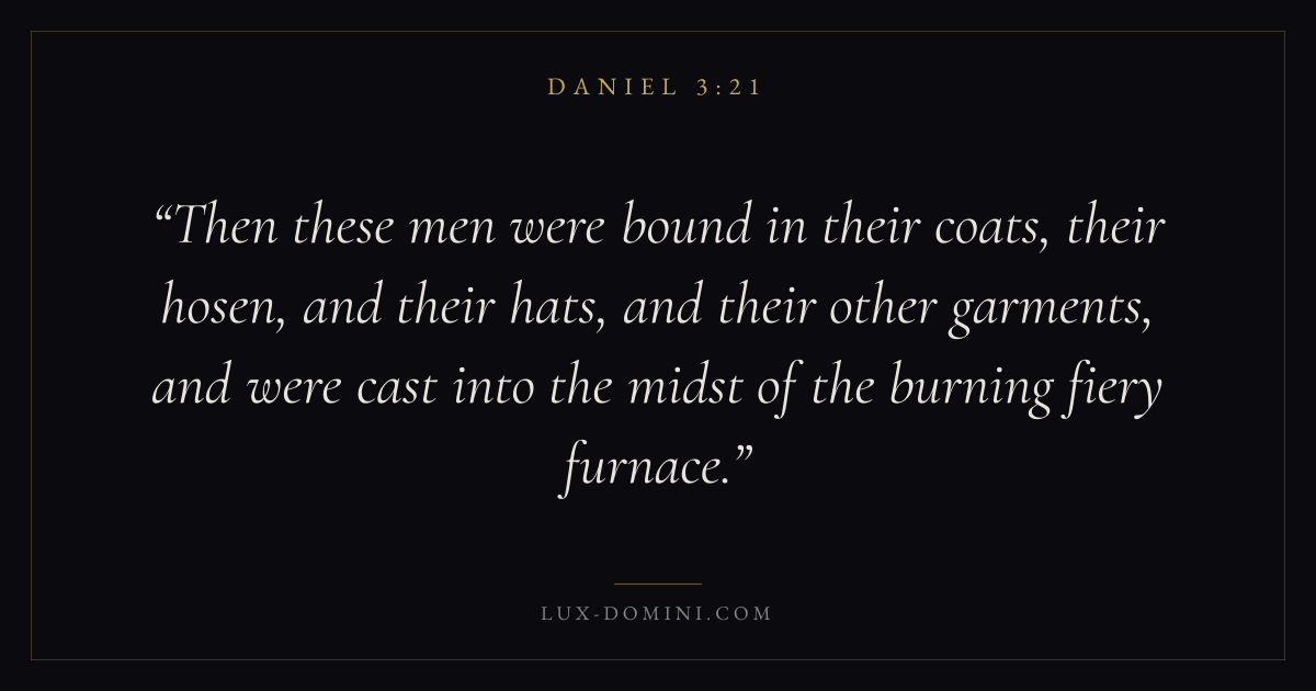 Then these men were bound in their coats, their hosen, and their hats, and their other garments, and were cast into the midst of the burning fiery furnace.