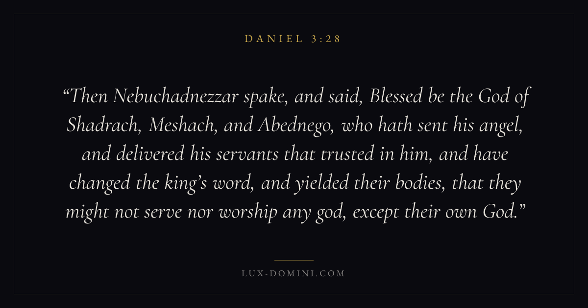 Then Nebuchadnezzar spake, and said, Blessed be the God of Shadrach, Meshach, and Abednego, who hath sent his angel, and delivered his servants that trusted in him, and have changed the king’s word, and yielded their bodies, that they might not serve nor worship any god, except their own God.