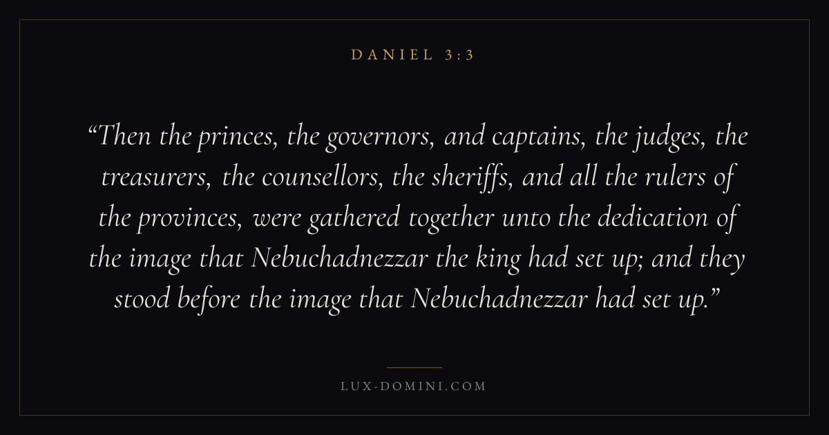Then the princes, the governors, and captains, the judges, the treasurers, the counsellors, the sheriffs, and all the rulers of the provinces, were gathered together unto the dedication of the image that Nebuchadnezzar the king had set up; and they stood before the image that Nebuchadnezzar had set up.