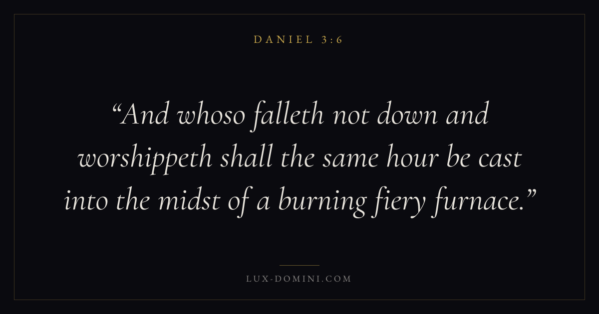 And whoso falleth not down and worshippeth shall the same hour be cast into the midst of a burning fiery furnace.