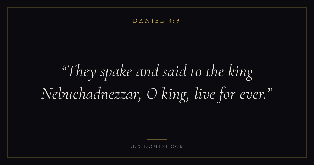 Books / Daniel / Chapter 3 / Verse 9 ← Daniel 3:8 Daniel 3:9 Daniel 3:10 → They spake and said to the king Nebuchadnezzar, O king, live for ever. Download verse card Share on Twitter Share on Facebook Pin it ✦ Key themes HopeWisdomTruthExile Read with Daniel 3:8Daniel 3:10Romans 8:24Revelation 21:4 Related topics Bible verses about hopeBible verses about wisdomBible verses about truth ✦ Daniel Chapter 3 verses V. 1 V. 2 V. 3 V. 4 V. 5 V. 6 V. 7 V. 8 V. 9 V. 10 V. 11 V. 12 V. 13 V. 14 V. 15 V. 16 V. 17 V. 18 V. 19 V. 20 V. 21 V. 22 V. 23 V. 24 V. 25 V. 26 V. 27 V. 28 V. 29 V. 30