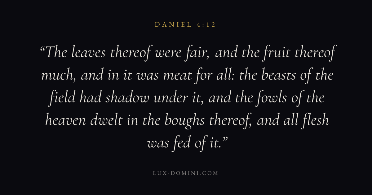 The leaves thereof were fair, and the fruit thereof much, and in it was meat for all: the beasts of the field had shadow under it, and the fowls of the heaven dwelt in the boughs thereof, and all flesh was fed of it.