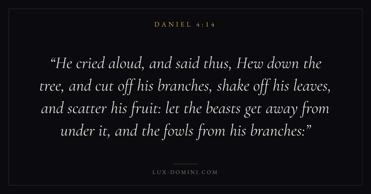 He cried aloud, and said thus, Hew down the tree, and cut off his branches, shake off his leaves, and scatter his fruit: let the beasts get away from under it, and the fowls from his branches: