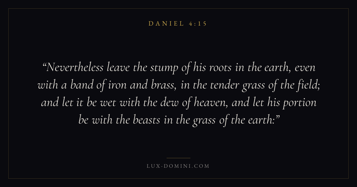 Nevertheless leave the stump of his roots in the earth, even with a band of iron and brass, in the tender grass of the field; and let it be wet with the dew of heaven, and let his portion be with the beasts in the grass of the earth: