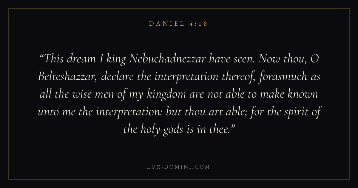 This dream I king Nebuchadnezzar have seen. Now thou, O Belteshazzar, declare the interpretation thereof, forasmuch as all the wise men of my kingdom are not able to make known unto me the interpretation: but thou art able; for the spirit of the holy gods is in thee.