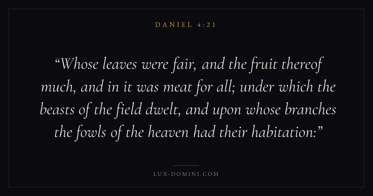 Whose leaves were fair, and the fruit thereof much, and in it was meat for all; under which the beasts of the field dwelt, and upon whose branches the fowls of the heaven had their habitation: