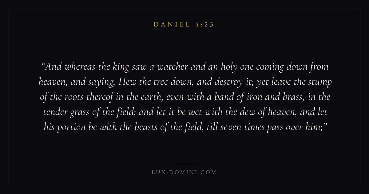 And whereas the king saw a watcher and an holy one coming down from heaven, and saying, Hew the tree down, and destroy it; yet leave the stump of the roots thereof in the earth, even with a band of iron and brass, in the tender grass of the field; and let it be wet with the dew of heaven, and let his portion be with the beasts of the field, till seven times pass over him;