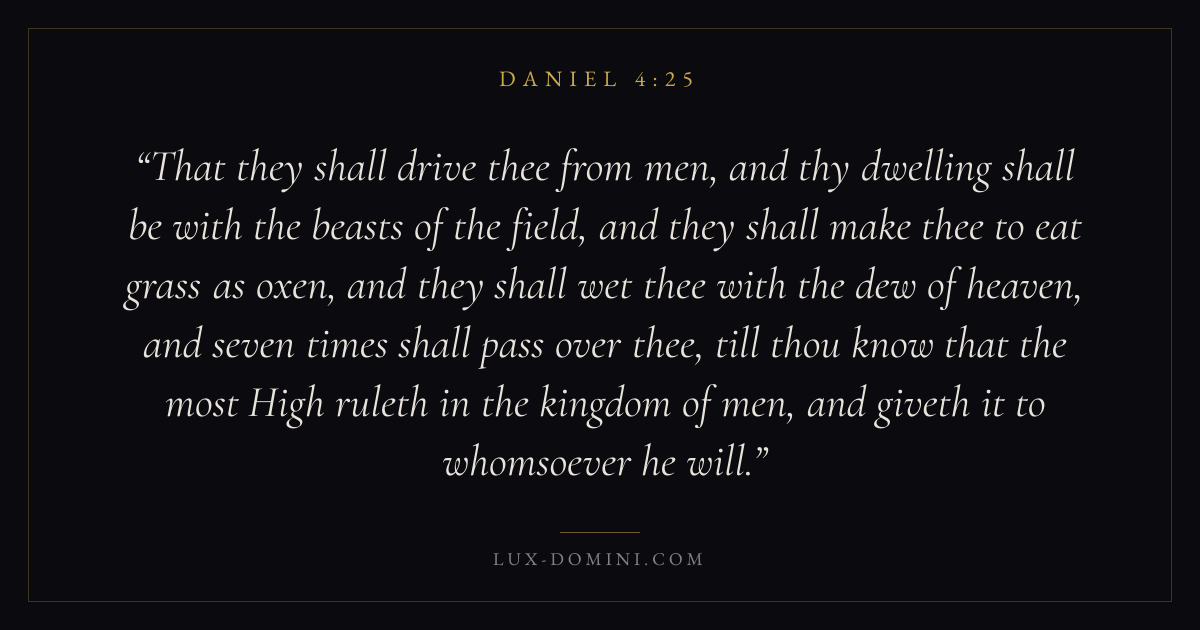 That they shall drive thee from men, and thy dwelling shall be with the beasts of the field, and they shall make thee to eat grass as oxen, and they shall wet thee with the dew of heaven, and seven times shall pass over thee, till thou know that the most High ruleth in the kingdom of men, and giveth it to whomsoever he will.