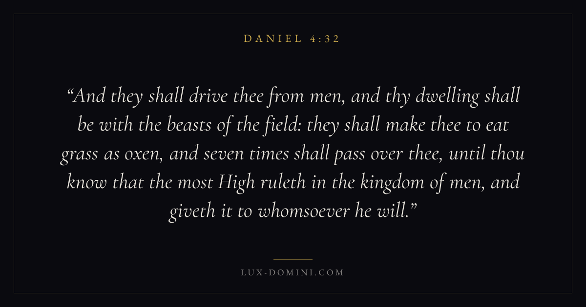 And they shall drive thee from men, and thy dwelling shall be with the beasts of the field: they shall make thee to eat grass as oxen, and seven times shall pass over thee, until thou know that the most High ruleth in the kingdom of men, and giveth it to whomsoever he will.