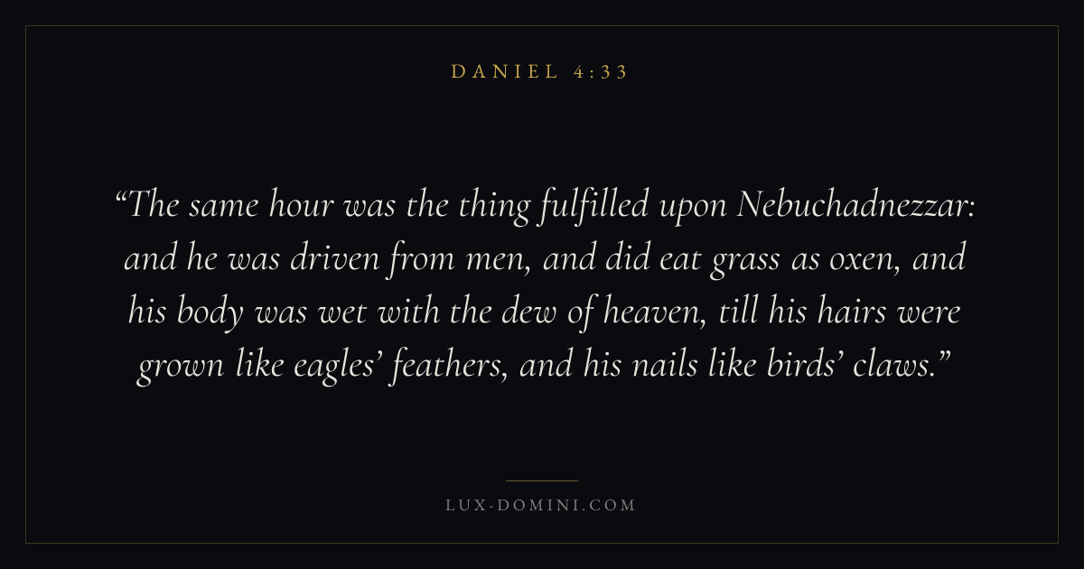 The same hour was the thing fulfilled upon Nebuchadnezzar: and he was driven from men, and did eat grass as oxen, and his body was wet with the dew of heaven, till his hairs were grown like eagles’ feathers, and his nails like birds’ claws.