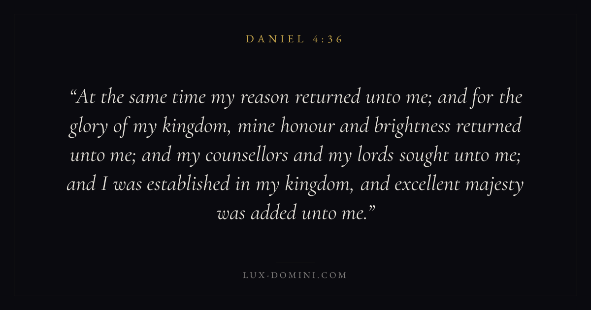 At the same time my reason returned unto me; and for the glory of my kingdom, mine honour and brightness returned unto me; and my counsellors and my lords sought unto me; and I was established in my kingdom, and excellent majesty was added unto me.