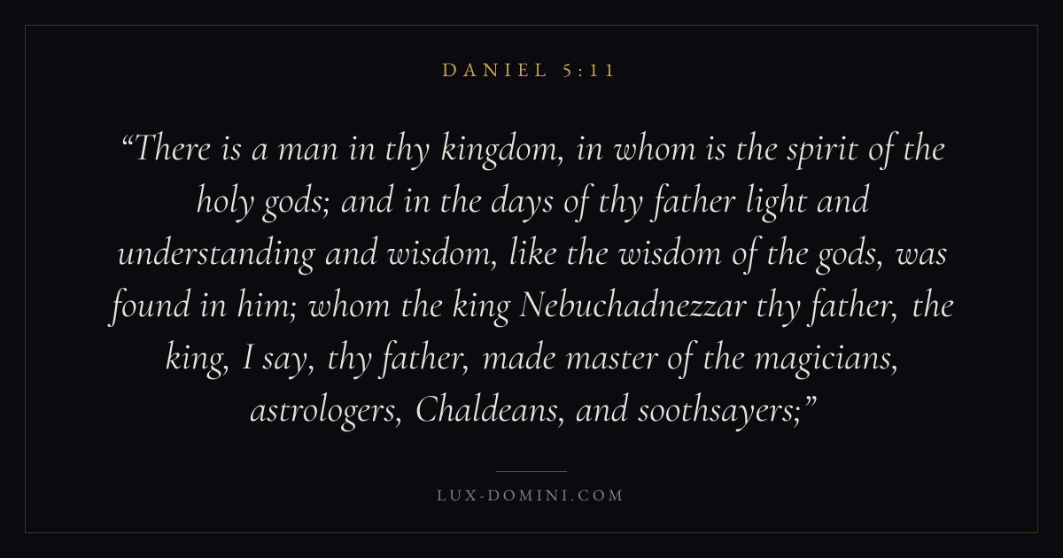 There is a man in thy kingdom, in whom is the spirit of the holy gods; and in the days of thy father light and understanding and wisdom, like the wisdom of the gods, was found in him; whom the king Nebuchadnezzar thy father, the king, I say, thy father, made master of the magicians, astrologers, Chaldeans, and soothsayers;