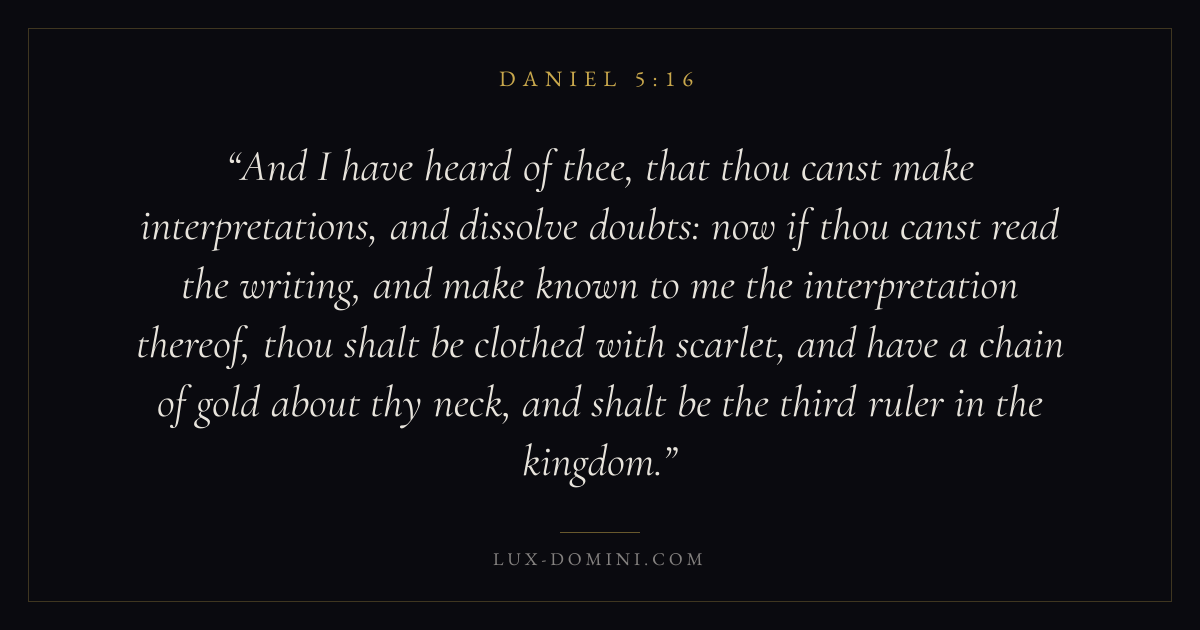 And I have heard of thee, that thou canst make interpretations, and dissolve doubts: now if thou canst read the writing, and make known to me the interpretation thereof, thou shalt be clothed with scarlet, and have a chain of gold about thy neck, and shalt be the third ruler in the kingdom.