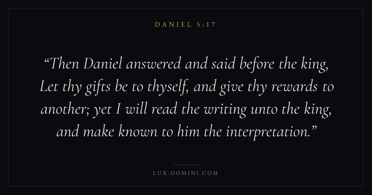 Then Daniel answered and said before the king, Let thy gifts be to thyself, and give thy rewards to another; yet I will read the writing unto the king, and make known to him the interpretation.