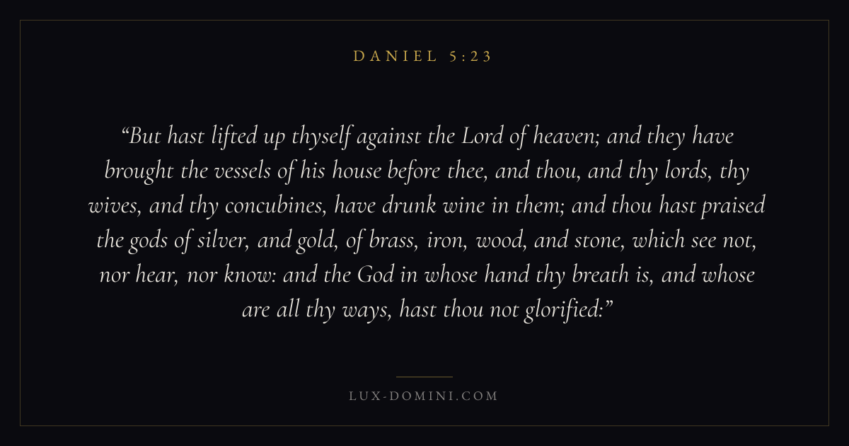 But hast lifted up thyself against the Lord of heaven; and they have brought the vessels of his house before thee, and thou, and thy lords, thy wives, and thy concubines, have drunk wine in them; and thou hast praised the gods of silver, and gold, of brass, iron, wood, and stone, which see not, nor hear, nor know: and the God in whose hand thy breath is, and whose are all thy ways, hast thou not glorified: