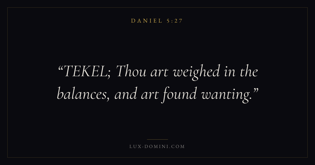 Books / Daniel / Chapter 5 / Verse 27 ← Daniel 5:26 Daniel 5:27 Daniel 5:28 → TEKEL; Thou art weighed in the balances, and art found wanting. Download verse card Share on Twitter Share on Facebook Pin it ✦ Key themes HopeWisdomExileKingdom of God Read with Daniel 5:25Daniel 5:26Romans 8:24Revelation 21:4 Related topics Bible verses about hopeBible verses about wisdom ✦ Daniel Chapter 5 verses V. 1 V. 2 V. 3 V. 4 V. 5 V. 6 V. 7 V. 8 V. 9 V. 10 V. 11 V. 12 V. 13 V. 14 V. 15 V. 16 V. 17 V. 18 V. 19 V. 20 V. 21 V. 22 V. 23 V. 24 V. 25 V. 26 V. 27 V. 28 V. 29 V. 30 V. 31