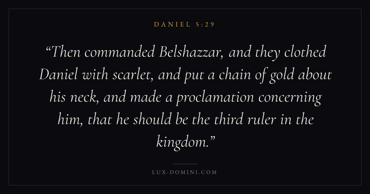 Then commanded Belshazzar, and they clothed Daniel with scarlet, and put a chain of gold about his neck, and made a proclamation concerning him, that he should be the third ruler in the kingdom.