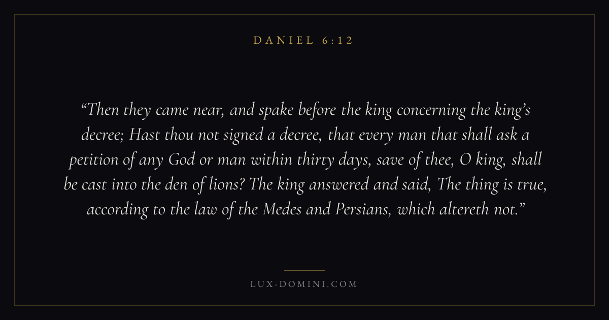 Then they came near, and spake before the king concerning the king’s decree; Hast thou not signed a decree, that every man that shall ask a petition of any God or man within thirty days, save of thee, O king, shall be cast into the den of lions? The king answered and said, The thing is true, according to the law of the Medes and Persians, which altereth not.