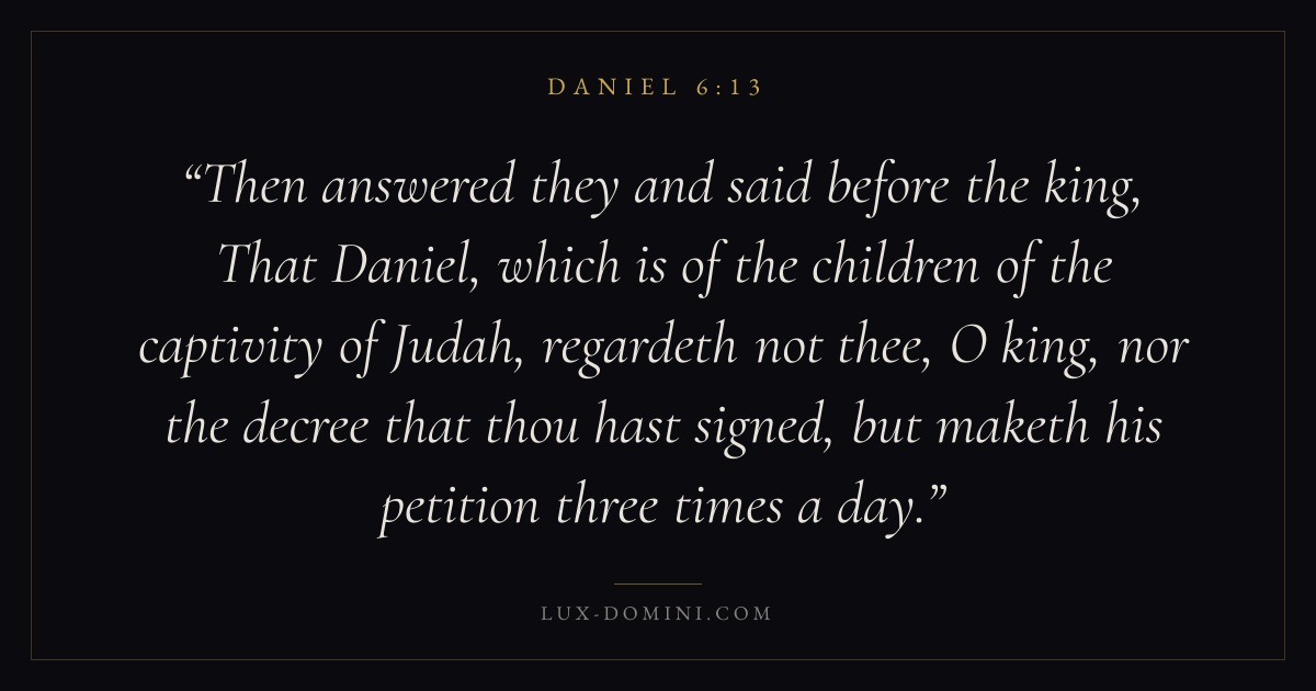 Then answered they and said before the king, That Daniel, which is of the children of the captivity of Judah, regardeth not thee, O king, nor the decree that thou hast signed, but maketh his petition three times a day.