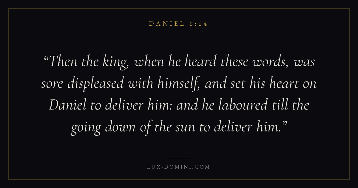 Then the king, when he heard these words, was sore displeased with himself, and set his heart on Daniel to deliver him: and he laboured till the going down of the sun to deliver him.
