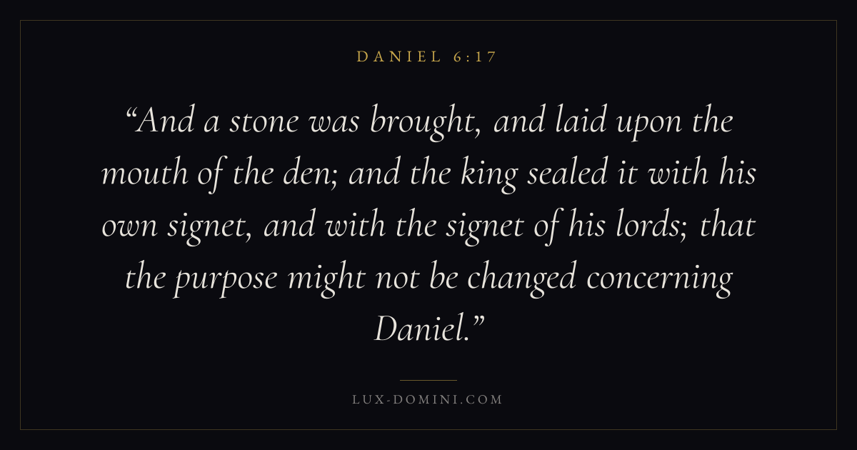 And a stone was brought, and laid upon the mouth of the den; and the king sealed it with his own signet, and with the signet of his lords; that the purpose might not be changed concerning Daniel.