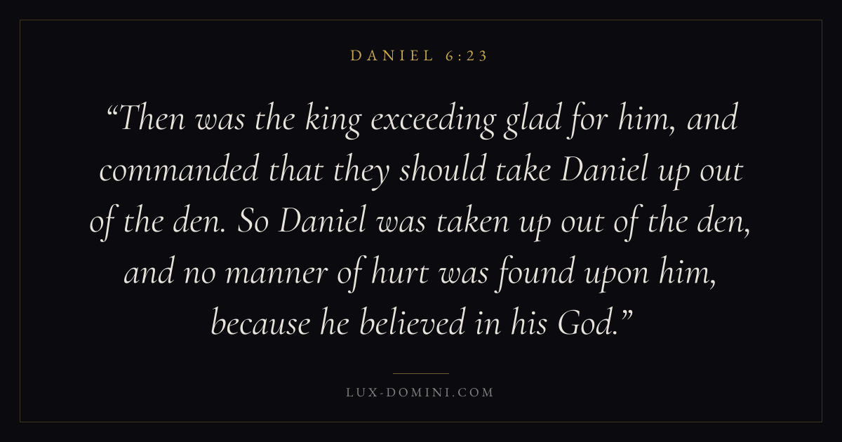 Then was the king exceeding glad for him, and commanded that they should take Daniel up out of the den. So Daniel was taken up out of the den, and no manner of hurt was found upon him, because he believed in his God.