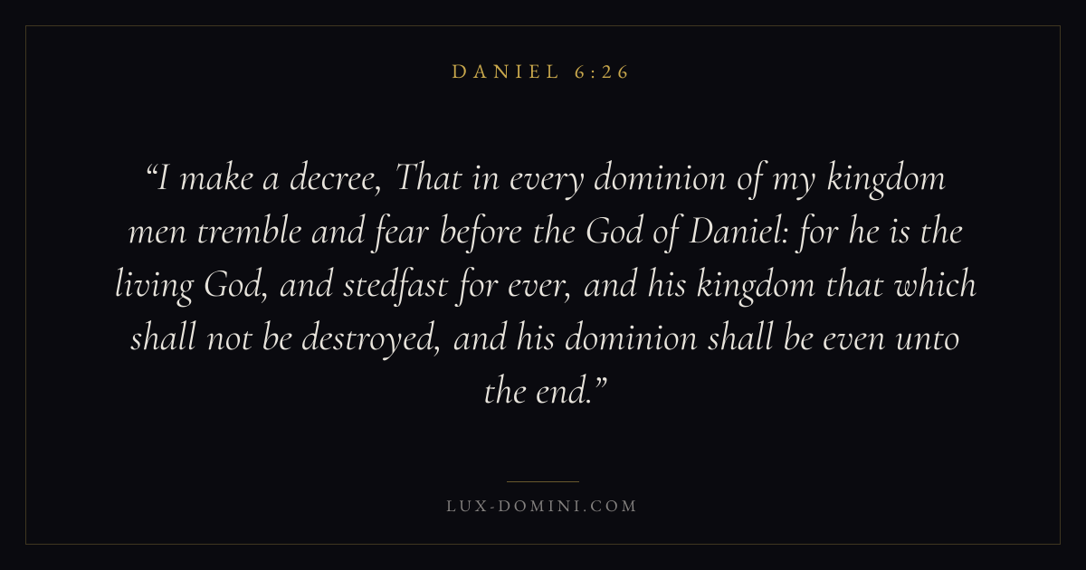 I make a decree, That in every dominion of my kingdom men tremble and fear before the God of Daniel: for he is the living God, and stedfast for ever, and his kingdom that which shall not be destroyed, and his dominion shall be even unto the end.