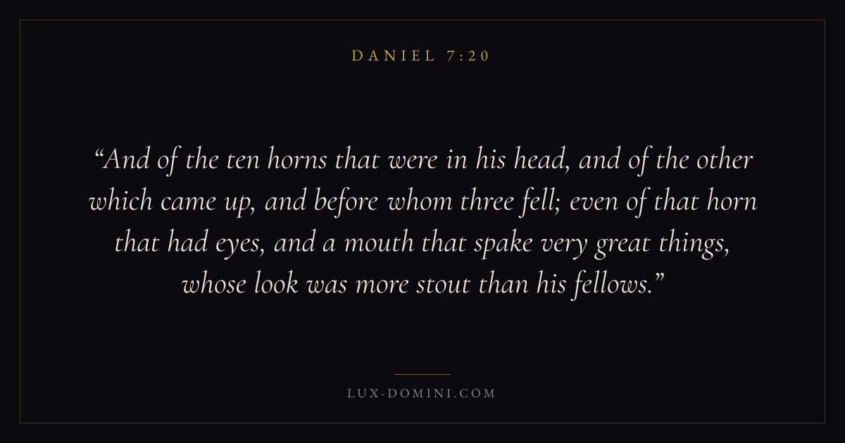 And of the ten horns that were in his head, and of the other which came up, and before whom three fell; even of that horn that had eyes, and a mouth that spake very great things, whose look was more stout than his fellows.