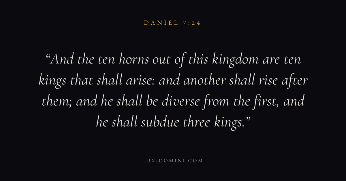 And the ten horns out of this kingdom are ten kings that shall arise: and another shall rise after them; and he shall be diverse from the first, and he shall subdue three kings.
