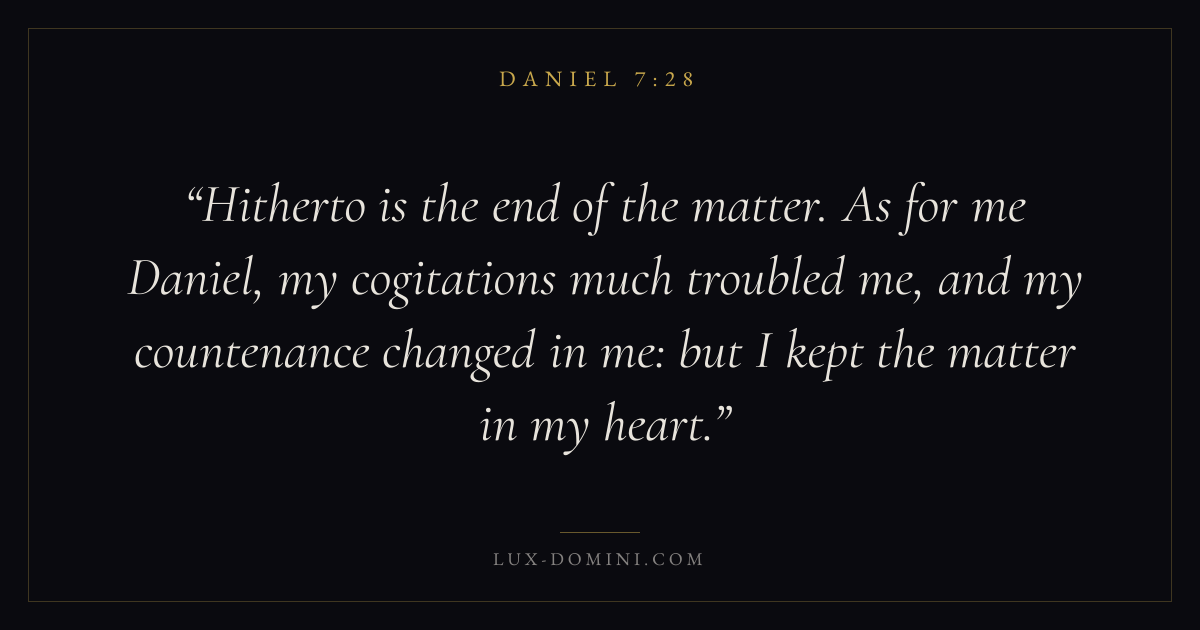 Hitherto is the end of the matter. As for me Daniel, my cogitations much troubled me, and my countenance changed in me: but I kept the matter in my heart.