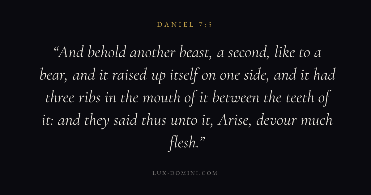 And behold another beast, a second, like to a bear, and it raised up itself on one side, and it had three ribs in the mouth of it between the teeth of it: and they said thus unto it, Arise, devour much flesh.