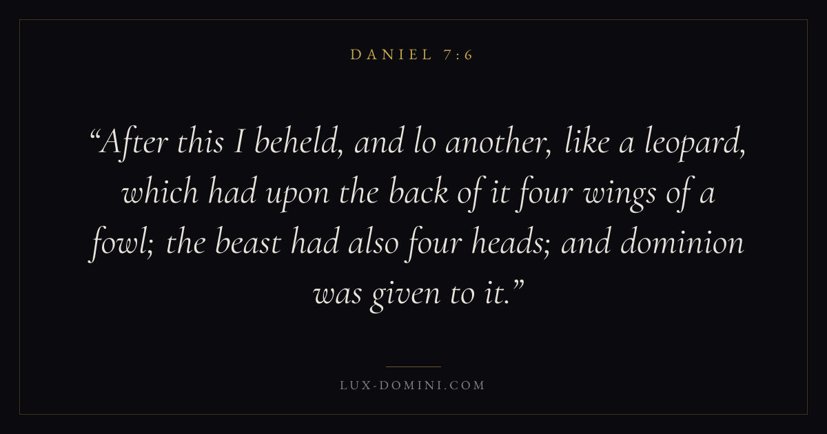After this I beheld, and lo another, like a leopard, which had upon the back of it four wings of a fowl; the beast had also four heads; and dominion was given to it.