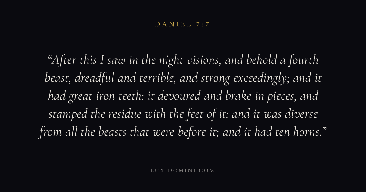 After this I saw in the night visions, and behold a fourth beast, dreadful and terrible, and strong exceedingly; and it had great iron teeth: it devoured and brake in pieces, and stamped the residue with the feet of it: and it was diverse from all the beasts that were before it; and it had ten horns.