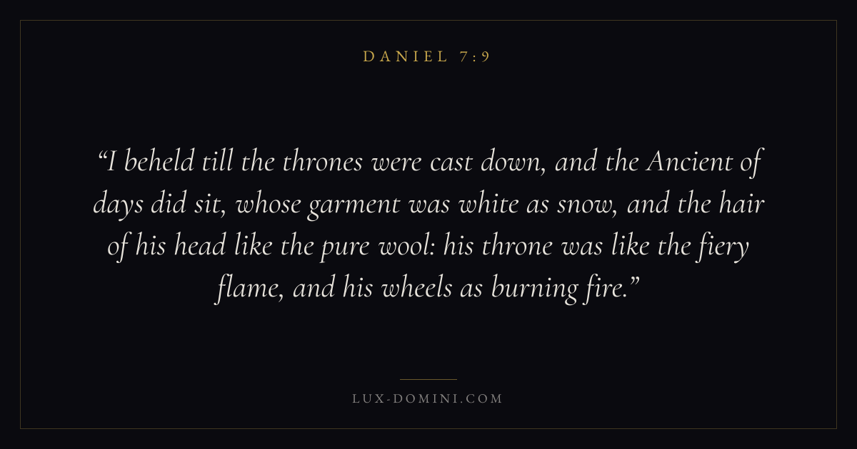 I beheld till the thrones were cast down, and the Ancient of days did sit, whose garment was white as snow, and the hair of his head like the pure wool: his throne was like the fiery flame, and his wheels as burning fire.