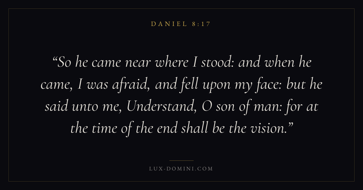 So he came near where I stood: and when he came, I was afraid, and fell upon my face: but he said unto me, Understand, O son of man: for at the time of the end shall be the vision.