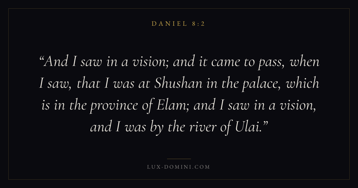And I saw in a vision; and it came to pass, when I saw, that I was at Shushan in the palace, which is in the province of Elam; and I saw in a vision, and I was by the river of Ulai.