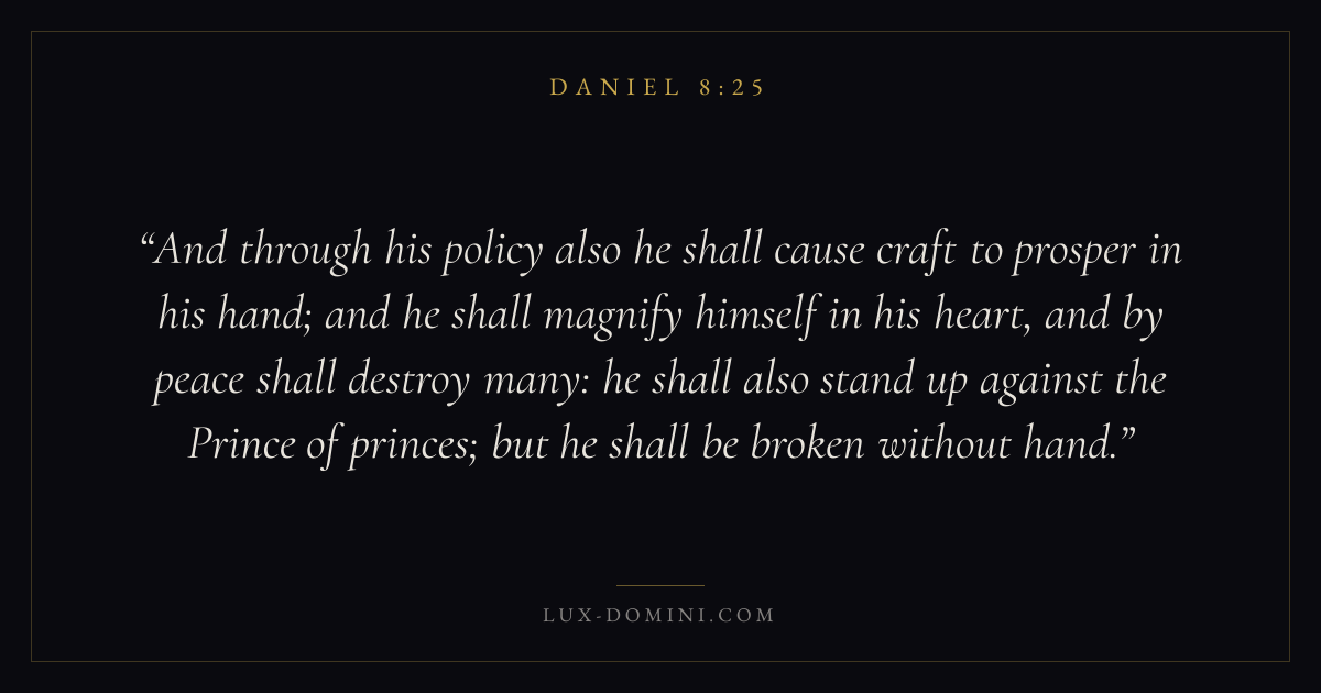 And through his policy also he shall cause craft to prosper in his hand; and he shall magnify himself in his heart, and by peace shall destroy many: he shall also stand up against the Prince of princes; but he shall be broken without hand.