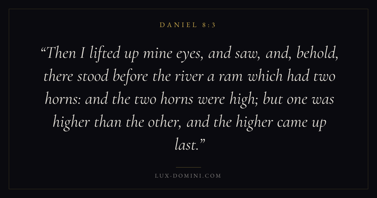 Then I lifted up mine eyes, and saw, and, behold, there stood before the river a ram which had two horns: and the two horns were high; but one was higher than the other, and the higher came up last.
