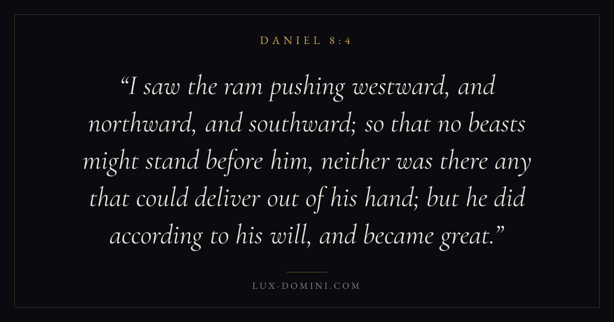 I saw the ram pushing westward, and northward, and southward; so that no beasts might stand before him, neither was there any that could deliver out of his hand; but he did according to his will, and became great.